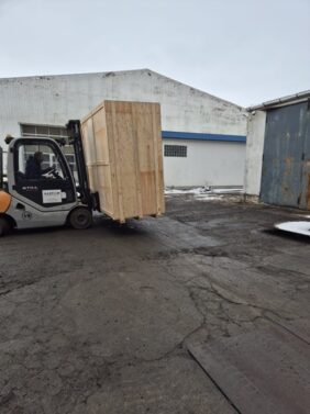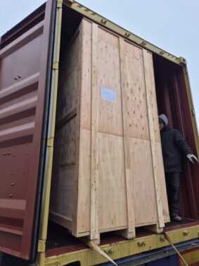 Das Entladen der Container ist eine filigrane Angelegenheit, da ein Großteil der Kisten eine Höhe von 2,52m hat. Da bleiben an der Containertür nur knappe 7 cm Luft nach oben.